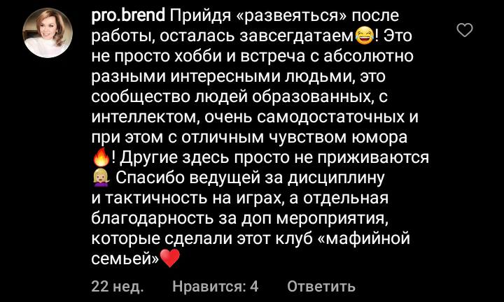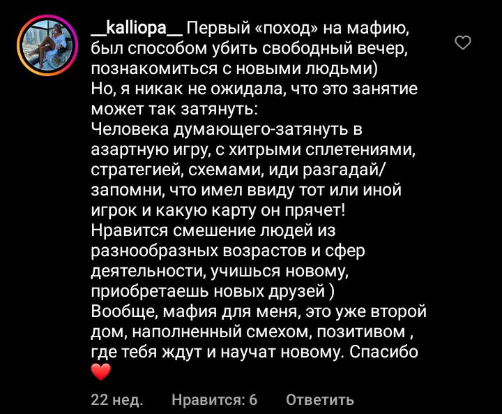 Игра, которая научит тебя излагать свои мысли, отстаивать свою точку зрения и убеждать других. Ты прокачаешь свое ораторское мастерство и сможешь проверить степень стрессоустойчивости в непростой ситуации. В общем, "Мафия" - это круто! Это всегда масса ярких впечатлений и всегда новое открытие!